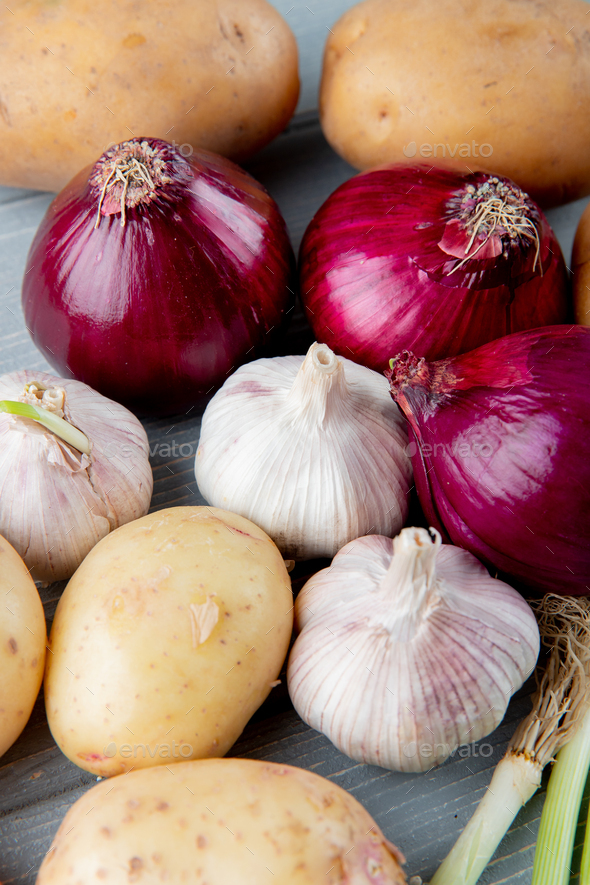 The storage guidelines for potatoes, onions, and garlic are similar in that they all can be stored in a cool, dry, dark and ventilated area, however, potatoes